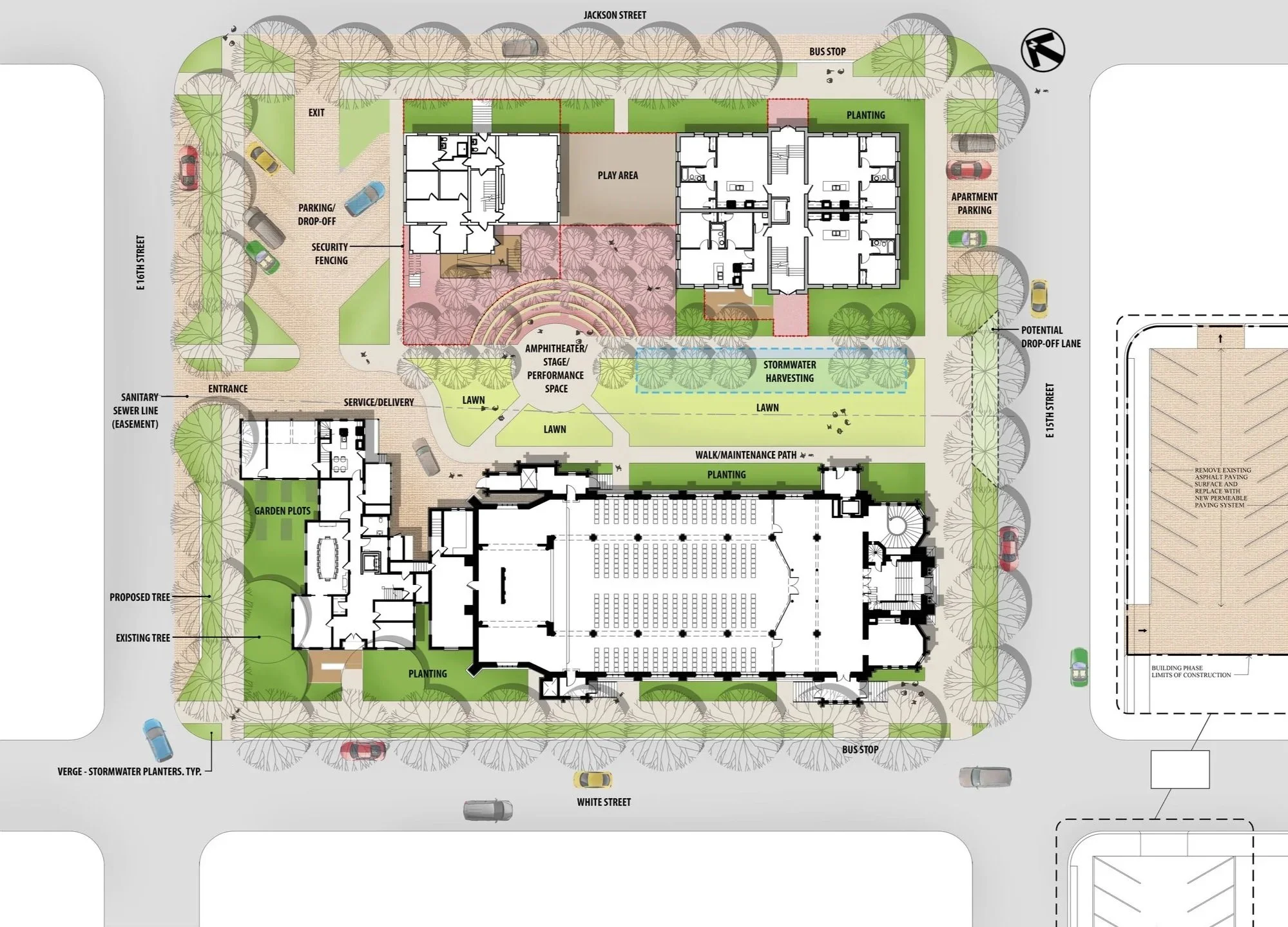 Engaging the neighborhood was another critical aspect of the project. JBC hosted public meetings where community opinion was initially divided, but through dialogue, design revisions, and persistence, the project gained strong support. Today, the park is well-received and actively used, reflecting its success as a community asset. Beyond the open space and event lawn, JBC also designed an age-appropriate playground for the childcare center housed in the former rectory, further extending the site’s value to local families.