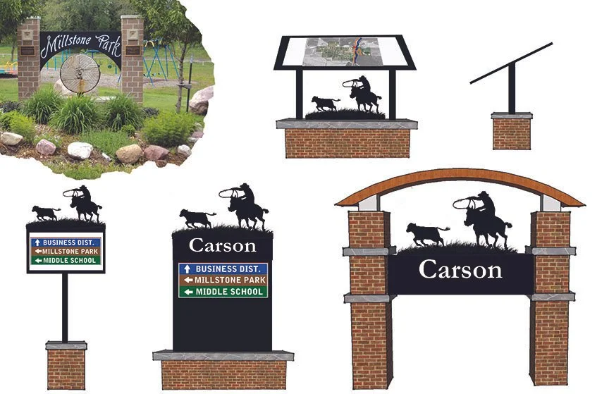 Carson, Iowa has a strong connection to their Western and agricultural herritage which inspired the two thematic families of wayfinding signage. Each theme is consistent in color and symbology to add a sense of community identity.