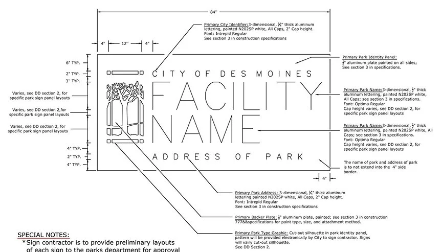 For the City of Des Moines Parks and Recreation Department, JBC was tasked with creating drawings and specifications for fabrication of new wayfinding signage at nine (9) different parks throughout the City’s system.