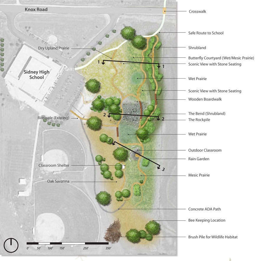 The final report presents coordinated recommendations across the community, including development of the Outdoor Classroom for educational programming, implementation of safe pedestrian connections to the high school, streetscape improvements with signage, lighting, and landscaping, and activation of the Pocket Park as a flexible community space. Presentation boards documented each recommendation, providing Sidney with a clear, actionable vision to guide investment, preserve local character, and support long-term community and corridor enhancements.