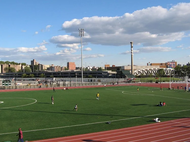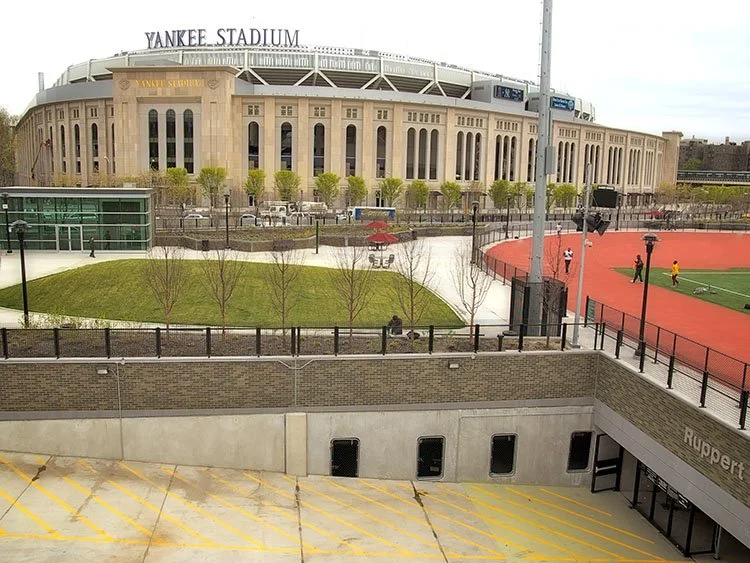 Located atop a two-story parking structure, the 3.25-acre park features a 400-meter running track surrounding an all-weather synthetic turf soccer field, as well as basketball and handball courts, exercise equipment, landscaped berms, and built-in spectator seating. A modern comfort station and accessible recreation areas for adults and children further contribute to the park’s role as a vibrant community hub. The $35 million project formed part of the $195 million Yankee Stadium Redevelopment effort, which sought to reinvest in the South Bronx neighborhood.